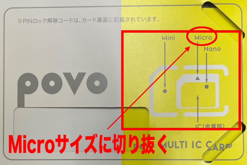 povo2.0のSIMカードはマルチカットなので、くり抜き方によって3種類のサイズになります。この発信機では中くらいのサイズである「Micro」で使用します。Nanoサイズで発信機へ入れると取り出せなくなり終了となります。