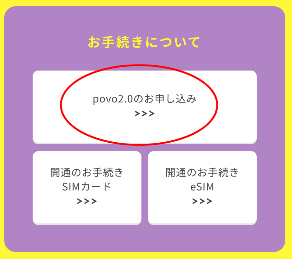 まだpovo2.0を申し込んでいない方はhttps://povo.jp/へ飛んで下までスクロールしてpovo2.0のお申し込みを押してSIMカードを申し込んでください。